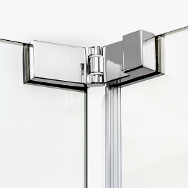- Zawiasy umożliwiające złożenie drzwi - połączenie dwóch szklanych skrzydeł zawiasami umożliwia złożenie drzwi w połowie do wewnątrz kabiny. Dzięki temu ciekawemu rozwiązaniu uzyskamy szerokie wejście dostępne do tej pory wyłącznie w drzwiach uchylnych