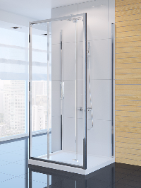 - Zawiasy umożliwiające złożenie drzwi - połączenie dwóch szklanych skrzydeł zawiasami umożliwia złożenie drzwi w połowie do wewnątrz kabiny. Dzięki temu ciekawemu rozwiązaniu uzyskamy szerokie wejście dostępne do tej pory wyłącznie w drzwiach uchylnych
