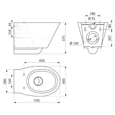Otwory do mocowania deski sedesowej. Dostarczana z zaślepkami z Inoxu do użycia bez deski sedesowej.