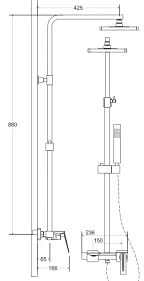 Zestaw prysznicowy : wąż 150 cm, słuchawka prysznicowa oraz uchwyt przesuwny na kolumnie połączonej z deszczownicą.