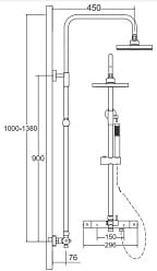 Zestaw prysznicowy : wąż 150 cm, słuchawka prysznicowa oraz uchwyt przesuwny na kolumnie połączonej z deszczownicą.
