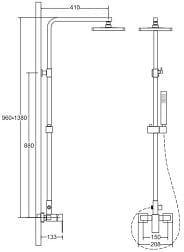Zestaw prysznicowy : wąż 150 cm, słuchawka prysznicowa oraz uchwyt przesuwny na kolumnie połączonej z deszczownicą.