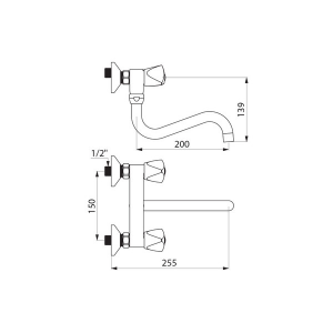 Bateria ścienna do zlewu z ruchomą wylewką rura L.200 mm, wylewka dolna Ø22 z sitkiem gwiazda z mosiądzu.