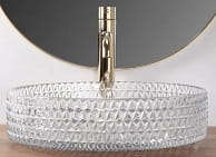 Nowoczesna kryształowa umywalka z serii Cristal będzie wspaniale wyróżniać się w twojej stylowej łazience. Została wykonana z wysokogatunkowego szkła, przystosowana do montażu na blacie bądź szafce. Ciekawy efekt wizualny podkreśli odbijające się w kryształkach światło. Umywalka o kryształowym wykończeniu niewątpliwie wyróżnia się ciekawym wzornictwem i designem.