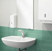 Elektroniczny, ścienny dozownik mydła w płynie.