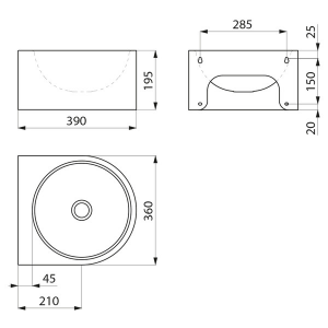 Umywalka ścienna, 360 x 390 mm.