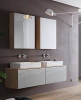 Kolekcja INVERTO daje możliwość tworzenia unikalnych połączeń szafek wiszących, dostępnych w wykończeniach: z płytką ceramiczną, ze szkłem hartowanym i lustrem.