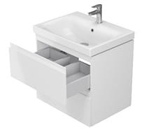 W skład zestawu wchodzi szafka podumywalkowa MODUO 50 biała z umywalką MODUO 50. Front wykonany został z płyty MDF 19 mm, lakierowanej w kolorze białym. W tym samym kolorze lakierowany jest również korpus. Szafka posiada wygodne, frezowane uchwyty i system cichego domykania szuflad. Wnętrze szuflad wykończone zostało w eleganckim, szarym odcieniu.