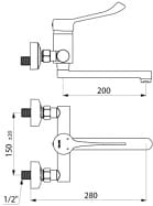 Ścienna bateria mechaniczna z płaską, ruchomą wylewką dolną L.200 wyposażoną w sitko higieniczne.
