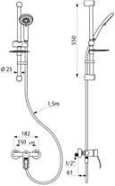 • Drążek natryskowy Ø25, rozstaw regulowany do 670 mm, uchwyt do słuchawki natryskowej z regulacją wysokości i mydelniczka.