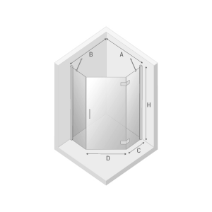Kabina prysznicowa pięciokątna z pojedynczymi drzwiami uchylnymi na zewnątrz. Doskonałe rozwiązanie dla posiadaczy niewielkiej łazienki dzięki ściętej linii drzwi.