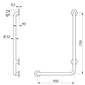 Poręcz natryskowa w kształcie litery „L” Ø32, dla osób niepełnosprawnych. Model lewy.
