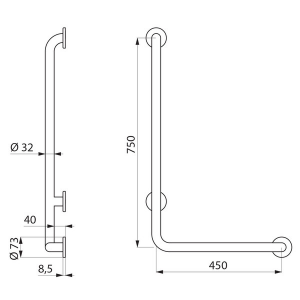 Poręcz natryskowa w kształcie litery „L” Ø32, H. 750 mm , model prawy , Inox satynowy
