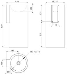 Umywalka na postumencie, wysokość 830 mm. Wewnętrzna średnica umywalki: 310 mm.