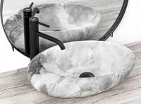 Nowoczesna seria umywalek imitujących kamień. Dzięki technice w jakiej została wykonywana wierzchnia warstwa umywalki, każdy egzemplarz posiada niepowtarzalny i unikalny wzór. Efekt ten imituje naturalny kamień. Ergonomiczny kształt misy pozwala na swobodny odpływ wody. Umywalkę można zamontować na blacie lub szafce.