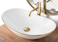 Śnieżnobiała umywalka ceramiczna nablatowa ze złotym rantem , o oryginalnym i niepowtarzalnym wyglądzie.