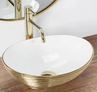 Biała/złota umywalka ceramiczna nablatowa,o oryginalnym i niepowtarzalnym wyglądzie.