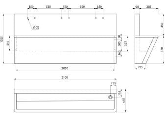 L. 2100 mm, 3 stanowiska. 6 otworów na armaturę Ø22 rozstaw 150 mm.