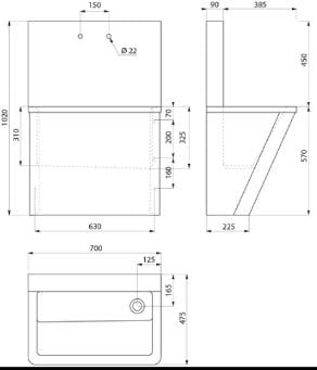 L. 700 mm, 1 stanowisko. 2 otwory na armaturę Ø22 rozstaw 150 mm.