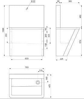 L. 700 mm, 1 stanowisko. Z 1 otworem na armaturę Ø22.