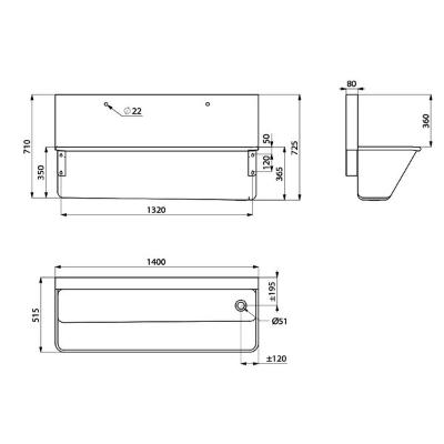DELABIE Umywalka chirurgiczna , ścienna , z wysoką, tylną ścianką , 140 cm szerokość