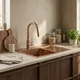 - Wykończenie w szczotkowanej miedzi – elegancki, miedziany odcień nadaje kuchni ciepłego charakteru. Co ważne, zlew posiada odpływ idealnie dopasowany kolorystycznie do wykończenia, co tworzy spójną i estetyczną całość.